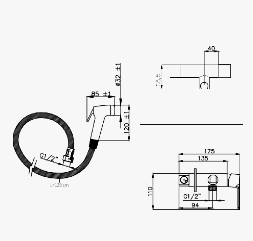 - Dimensions: The main body of the unit measures 175mm wide and 110mm tall, with a center-to-center distance of 94mm for the connections. The hand shower holder is 85mm wide and 120mm tall.