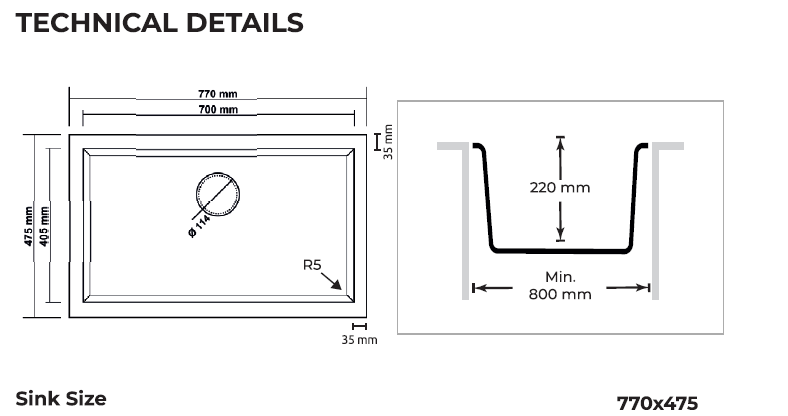- Optimal Dimensions: With external dimensions of 770×475 mm and a depth of 210 mm, this sink is a practical and functional choice for a wide range of kitchen layouts.
