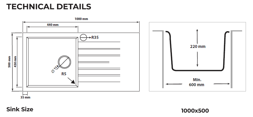 - Optimal Dimensions: The sink has external dimensions of 860×500 mm and a bowl depth of 210 mm, providing ample space for washing large cookware.